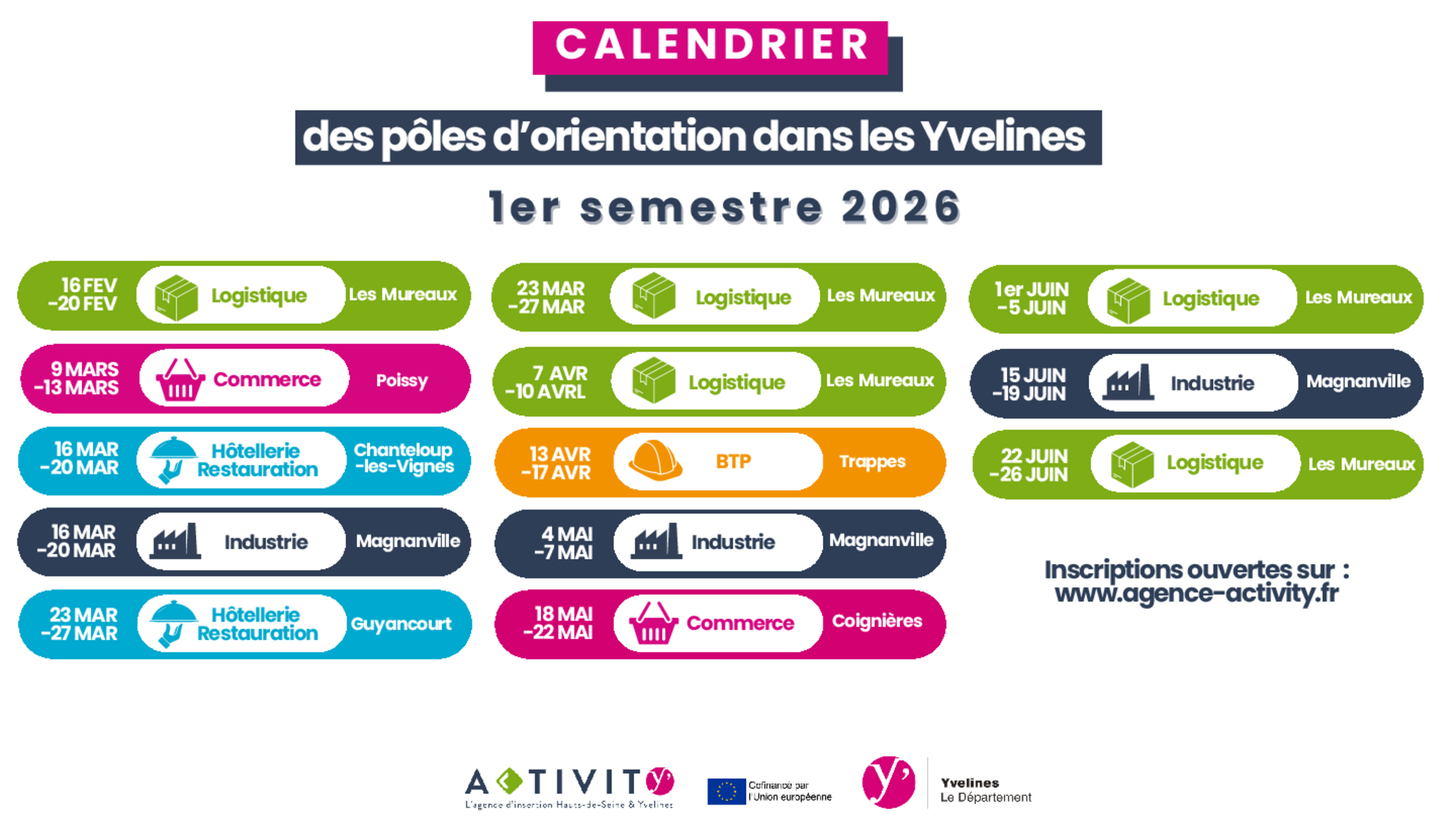 Le calendrier 2026 recense l’ensemble des sessions organisées dans les deux départements. Chaque pôle constitue une opportunité unique d’accompagner les bénéficiaires vers une meilleure connaissance des métiers et de leur environnement professionnel.