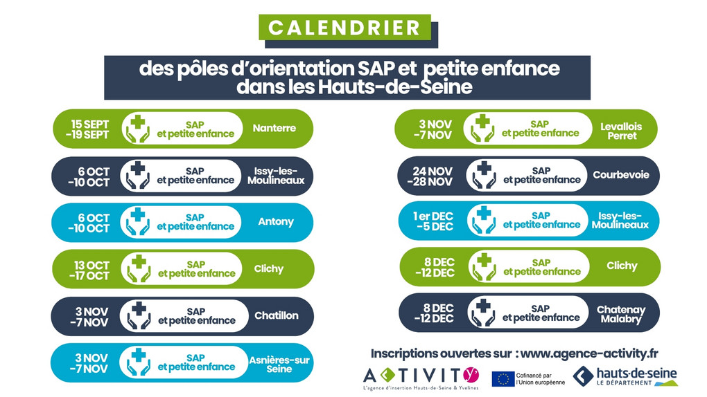 Tout au long de l’année 2025, ActivitY’ déploie ses pôles d’orientation dédiés aux métiers du Service à la Personne (SAP) et de la Petite Enfance, ouverts à tout public. Ces dispositifs orientent les demandeurs d’emploi et les salariés en reconversion vers des opportunités professionnelles durables, avec deux calendriers distincts pour les départements des Yvelines (78) et des Hauts-de-Seine (92).