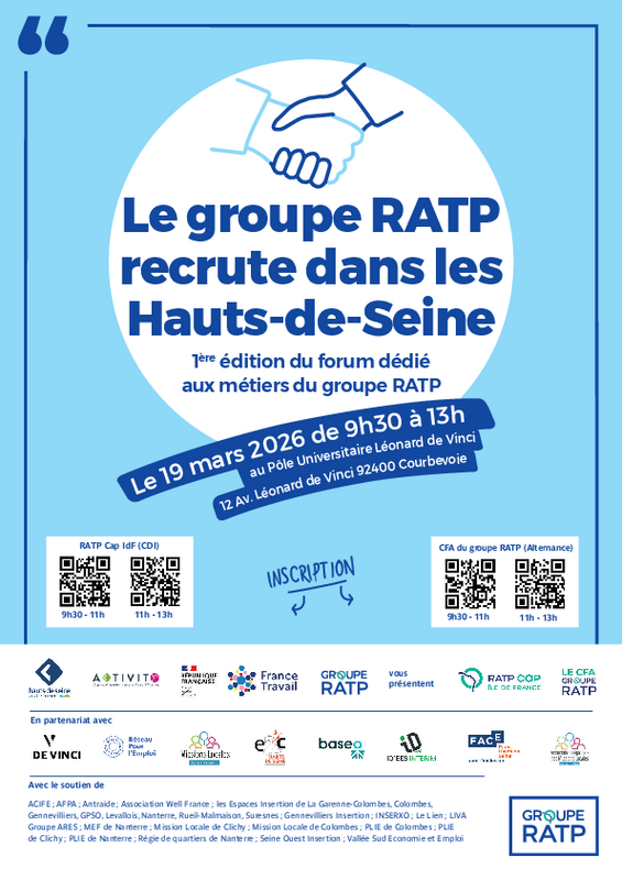 Organisé avec les acteurs de l’emploi du territoire, ce job dating mettra en lumière les besoins de recrutement du Groupe RATP, notamment au sein de RATP Cap Île-de-France et du CFA Groupe RATP.