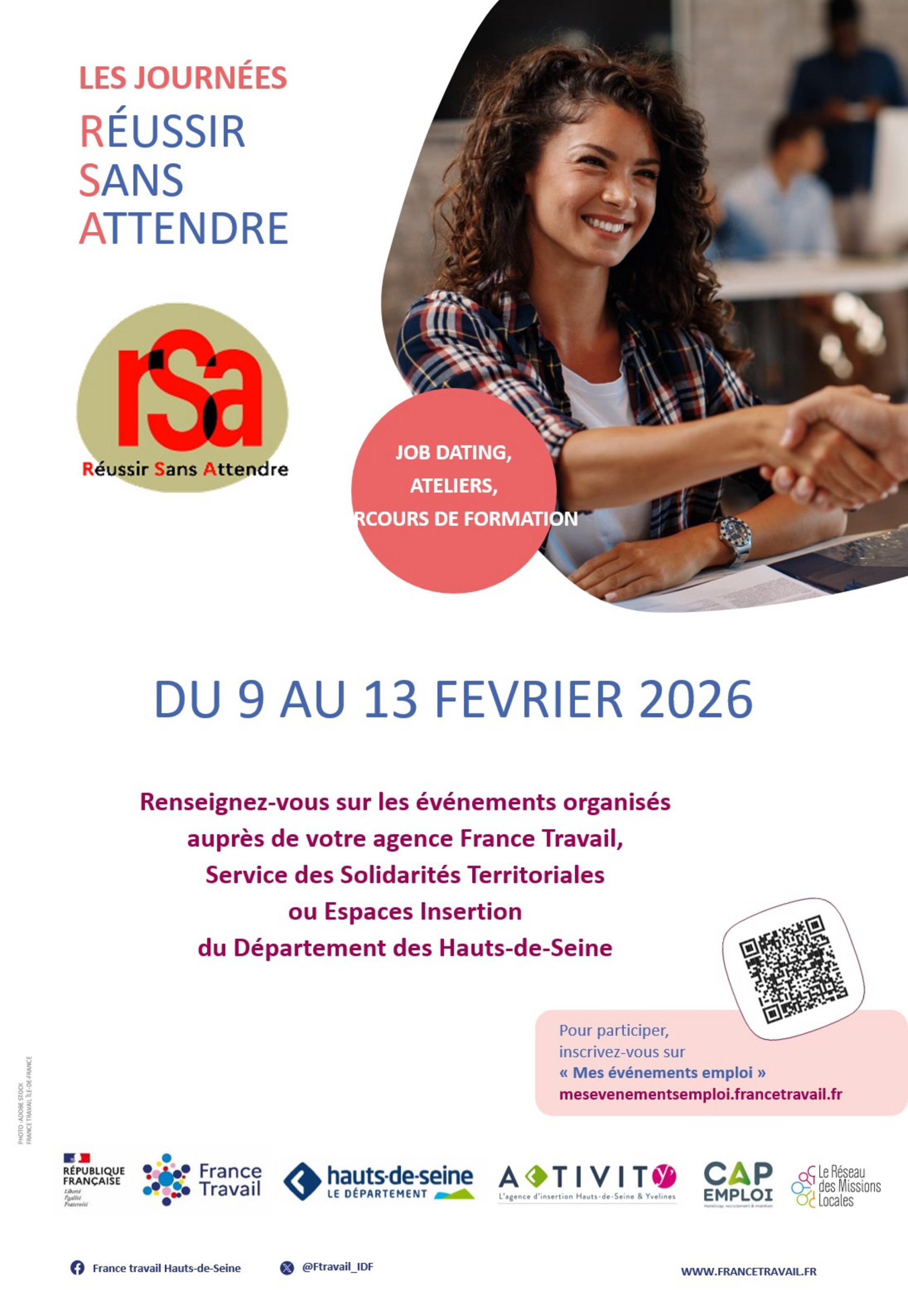 Du 9 au 13 février, ActivitY', agence d'insertion professionnelle du Département des Yvelines et des Hauts-de-Seine, s'associe à France Travail pour proposer une semaine entièrement dédiée à la mobilisation des allocataires du RSA des Hauts-de-Seine. À travers une programmation construite avec les Services des Solidarités Territoriales et les Espaces Insertion, l'objectif est clair : accélérer le retour à l’emploi en permettant aux participants de mieux connaître les secteurs qui recrutent, d'identifier des pistes professionnelles pertinentes et de bénéficier d'un accompagnement renforcé.